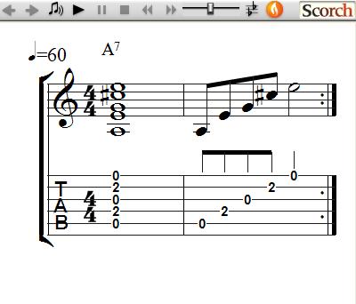 Each Music Score includes Sound that lets you Hear the Music and See the Timing for each string played by watching the Vertical Blue Line move across the Music over the Notes and TAB on the beat. Use the Controls on TOP of the Music Score to Play and practice at your own speed or change other settings.