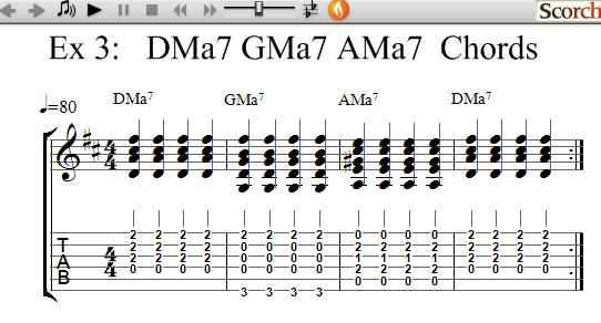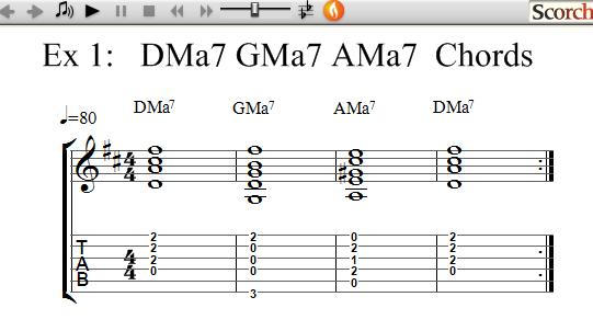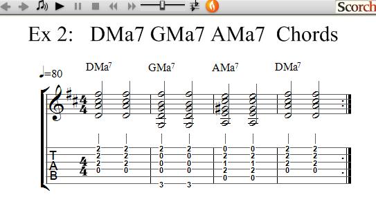 This exercise for the Left Handed guitarist uses the DMa7, GMa7 and AMa7 chords, which are each shown separately for you. Once you know how to play each chord try the exercises to get use to changing between chords and learning how to get the timing with your leftt hand by strumming as shown.