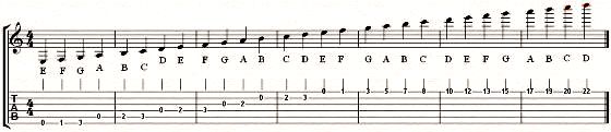 The guitar uses the Treble Clef with the notes shown below with TAB.