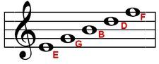 The five lines read upwards to spell E G B D F which you can remember using the phrase 'Every Good Boy Deserves Fudge'.