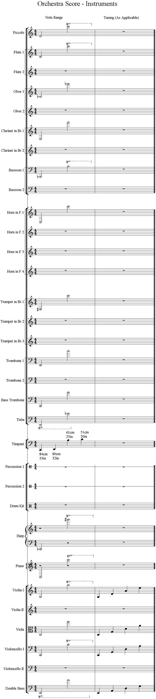 has its own staff with instrument families grouped together (as Shown Below). This overview will show the traditional order of instruments as they appear on an Orchestra Score, their respective Tuning, Range and the different Types of Orchestras.